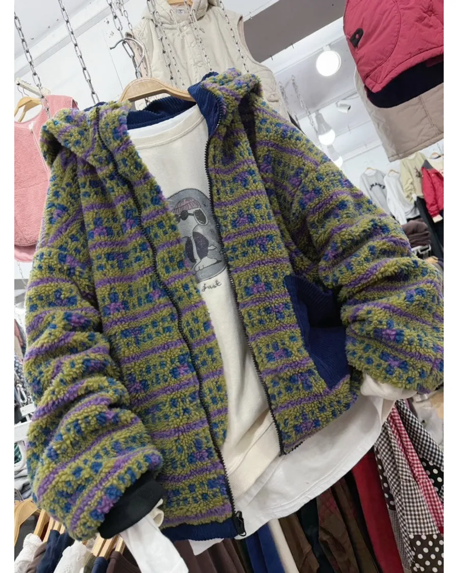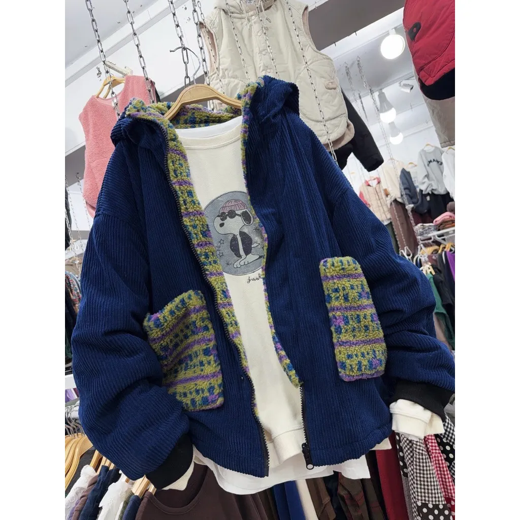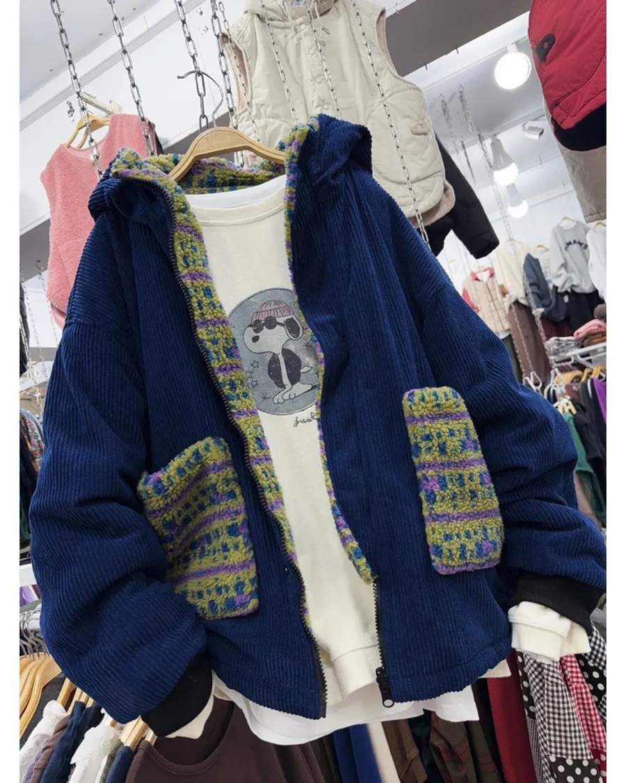 韓國🇰🇷燈芯絨正反可穿雪花圖帽外套