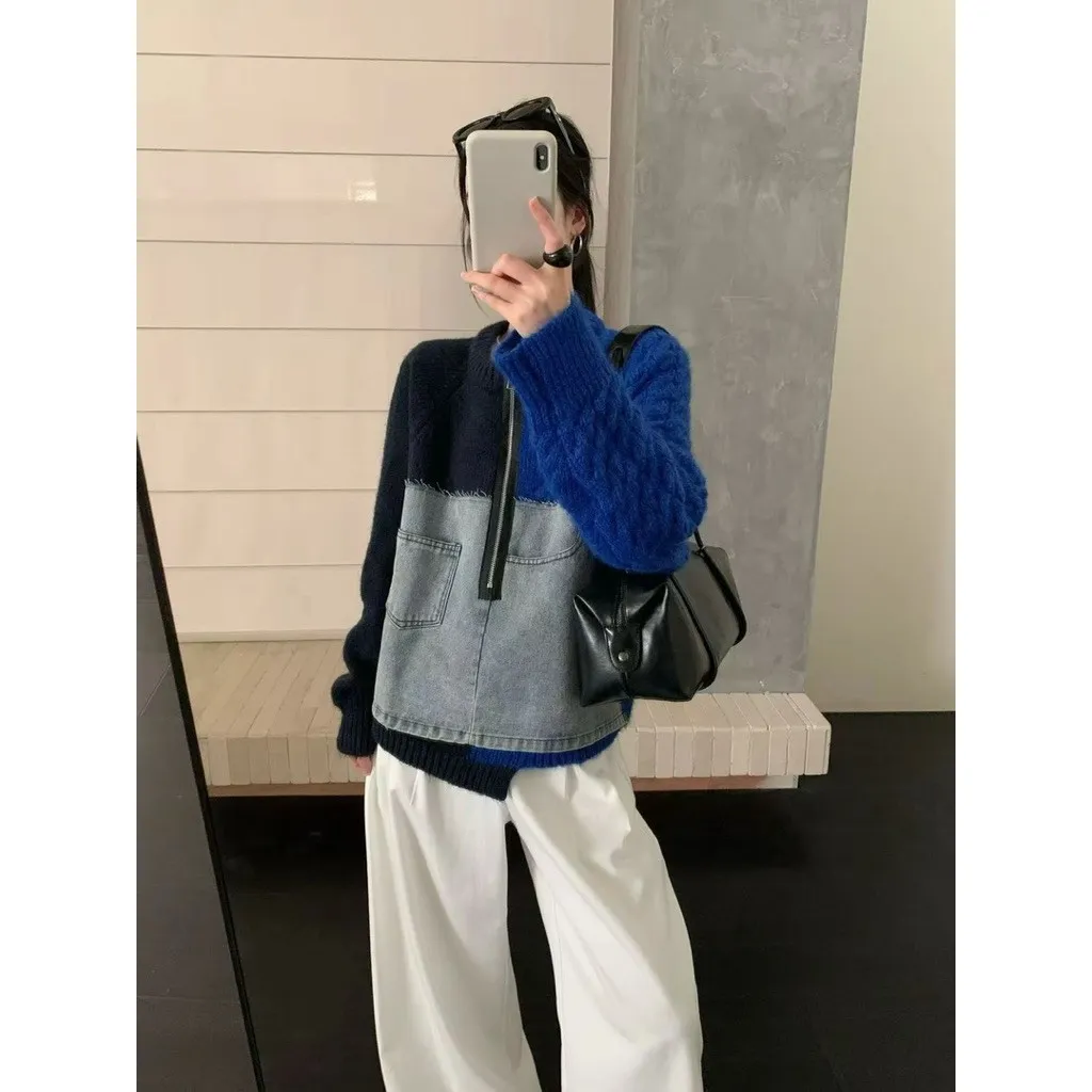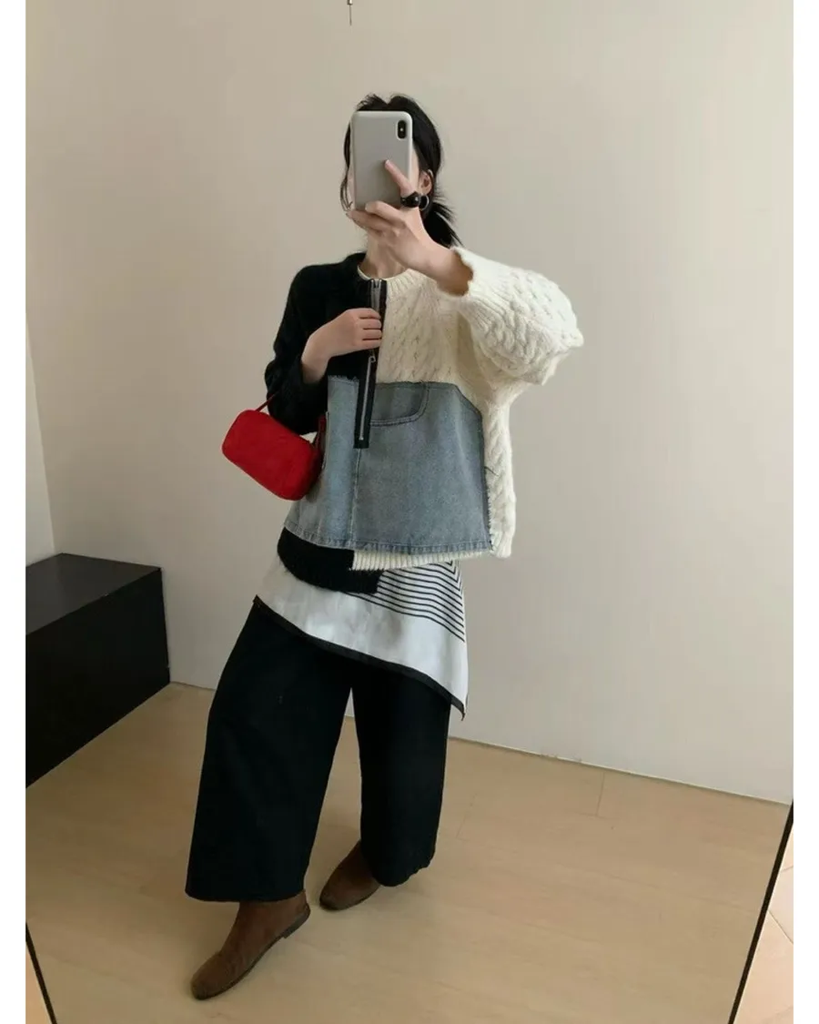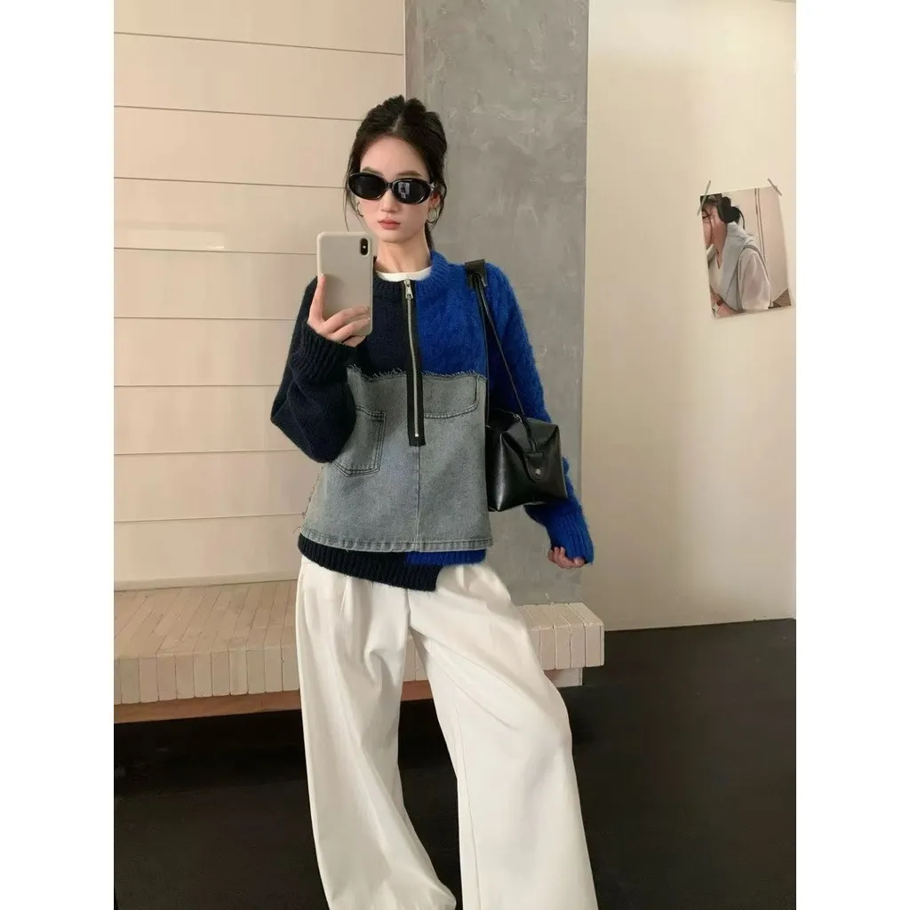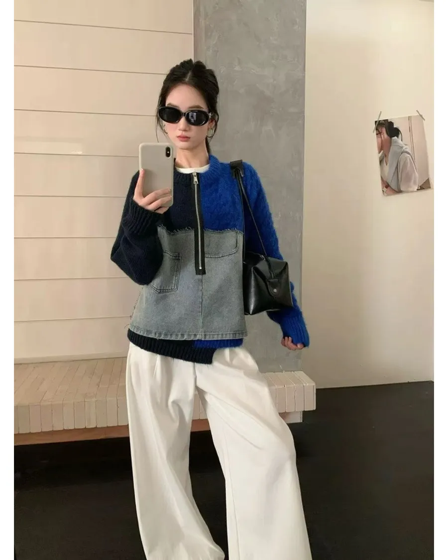 撞色針織牛仔拼接上衣
